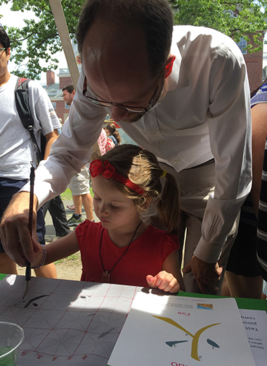 孔院的展位装饰着喜庆吉祥的大红灯笼,摆放着充满雅趣的笔墨纸砚和独具特色的中国结、毽子、剪纸等物品,以及各种宣传资料,充满了浓浓的中国味道。当地著名书法家梅宇国和波士顿大学艺术管理硕士、古筝专业演员龚琪应邀来到现场展示书法创作和古筝演奏,受到大家热烈欢迎。许多人现场体验并为之着迷,久久不愿离去。