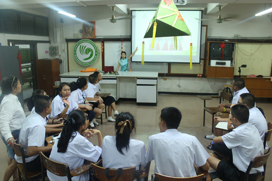 孔院教师从端午节的独特美食“粽子”入手,引导泰国学生了解屈原为了自己的国家投河而死,人民纷纷制作粽子喂鱼以保护屈原的故事,并告诉泰国学生,端午节除了吃粽子,还要赛龙舟,带香包,带五彩绳等等。同学们听得兴致勃勃,不断向老师提出关于端午节的问题。