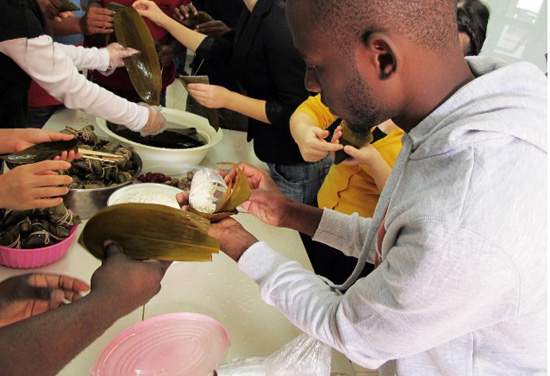 为了让学生亲身感受端午这一中国传统节日的氛围,教师们提前准备了包粽子的原材料,向学生一步步示范粽子的制作过程。在老师的耐心指导下,学生们终于成功地包出了自己的第一只粽子。