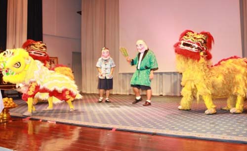 早8时,在吉拉达学校礼堂内,伴随着短促有力的鼓声,几只神采各异的狮子先后登场,舞台下变成了欢呼的海洋,掌声、笑声、喝彩声交织在一起。狮子们雄风尽展,花样层出:上单腿、贺拜、狮子洗面、舞大开灯所有的动作连贯一体,生动有力。场上的高潮出现在“金狮送金桔”的环节,金色的雄狮将准备好的桔子一一送到同学们手上,同学们既兴奋又好奇,毕竟是第一次亲眼看到这种原汁原味的舞狮。
