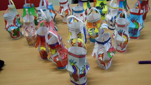 Bensley老师在一张纸片上印上了中国的吉祥物龙,并发放到学生手中,学生们一看到龙,就说起了自己所了解的有关中国的各种话题,他们可算是小小的中国专家。老师让学生们用自己喜欢的颜色给龙填上颜色,大部分学生都选用了红色,他们都知道,红色是中国的吉祥色,也是中国的节日色。有些学生甚至还画上了中国的国旗。灯笼制作完后,学生们都按耐不住地把灯笼展示在讲台上,他们的作品得到了老师的高度赞扬。