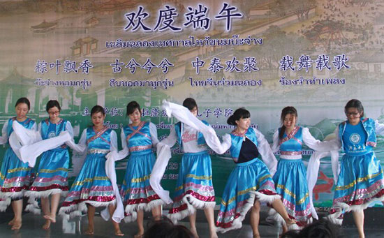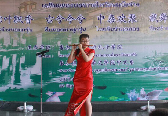活动中,孔子学院准备了美味的粽子和中华美食供师生品尝。泰国大学生赴华夏令营团员表演了藏族舞蹈《北京的金山上》,新任志愿者教师刘茜茜献上一曲《时间都去哪儿了》,张冰老师表演了笛子独奏《扬鞭催马运粮忙》,暑期学校师生合唱中文歌曲《老鼠爱大米》、《等待着你》和《月亮代表我的心》,赢得了现场师生们的阵阵掌声。