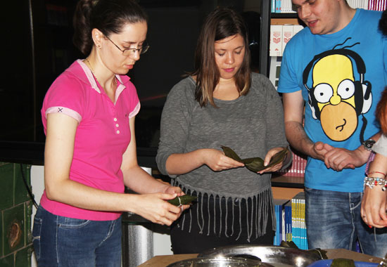 包粽子活动中,孔子学院特意准备了包粽子的糯米、粽叶,孔院师生用片片粽叶抒写心中的浓浓“粽”情,用自己的双手表达着对中国传统文化的热爱。