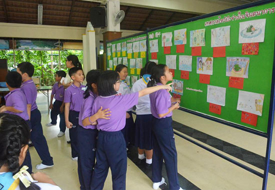 小学生们在给自己最喜欢的作品贴小苹果