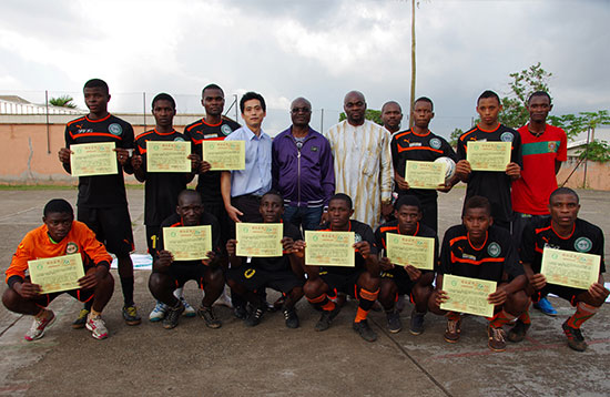 赛后,余院长向米拉赠送孔院T恤并期待今后开展更密切合作,汉语教师陈经纬代表足球班将精心制作的礼物送给米拉大叔。随后,米拉亲自为全体青少年球员颁发汉语结业证书。在记者采访中,米拉表示很高兴与雅温得第二大学孔子学院合作,希望队员们能够学好汉语,为将来去中国踢球打下良好基础。许多球员也表示,他们很喜欢中国,希望今后能去中国学习或加入中国职业俱乐部踢球。
