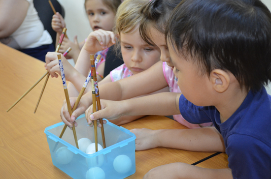 老师带领孩子们一起学唱儿歌、学用筷子,短短几十分钟过去,聪明伶俐的小朋友们已经会说“你好”、“再见”“谢谢”等简单的词语。