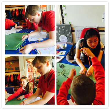 戚影老师一边耐心细致地讲解着中国结的来历,一边拿着绳子、图钉,以一线或多线为轴,在展板上一步一步教学生如何编制中国结。只见她灵巧的双手纵横穿梭,环环相扣,不一会儿功夫,精美的手链,别致的玫瑰戒指,多彩的吉祥扣,栩栩如生的蜻蜓一一展现在孩子们的面前。孩子们与老师一起动手,一节课后带着自己独具匠心的成品满意而归。