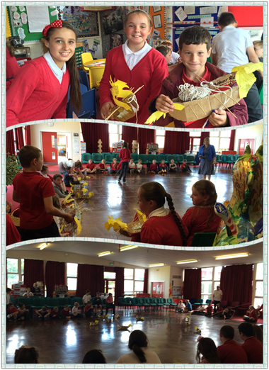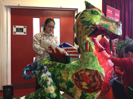 Millbrook小学师生精心布置了专门的汉语学习课堂,教室里装点着中国风筝、扇子、文房四宝、汉语字画,还有中国地图,汉语拼音角等。礼堂里两个石膏铸成的巨龙格外引人注目,一边是维妙维肖、活灵活现的威尔士龙,另一边则是正在由一群小朋友忙着彩绘上色的中国龙。