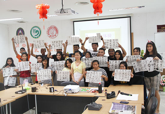 下午,学生们一边观赏邓丽君的演唱视频,一边兴趣勃勃地学唱起这三首歌曲。经过读、写、听、唱四个环节的操练,三首别具魅力、余韵悠长的古典诗文已经深深印在了来访的泰国学生们的脑海中。学生们用一曲《但愿人长久》大合唱,为一天的开放日活动写下了完美的句号。