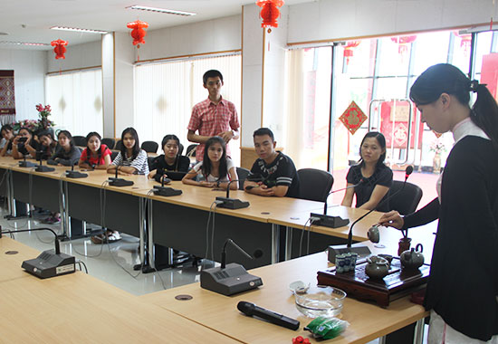 伴随着悠扬的琴声,孔子学院老师的茶道课程正式开讲。伟赉恳中学师生一边品味着清香扑鼻的绿茶,一边欣赏李白的《清平调词三首》、苏轼的《水调歌头·明月几时有》和李煜的《相见欢·无言独上西楼》三首中国古典诗文。孔院老师选择的这三首诗文别有深意,这三首诗文都曾被谱成流行歌曲,由深受泰国人民欢迎的女歌手邓丽君演唱。