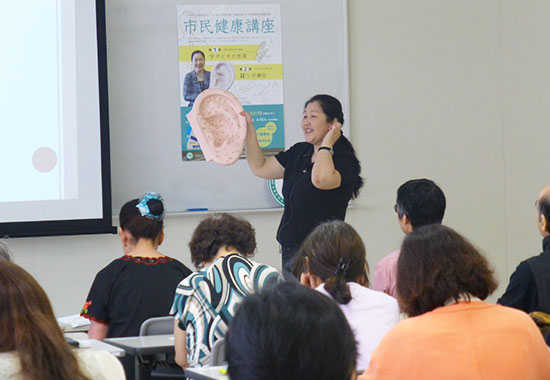 孔子学院院长、北京中医药大学针灸推拿学院教授邬继红分别以“穴位及其功效”和“耳穴贴压法”为题展开讲座 。讲座中,邬教授阐明了经络、腧穴的基本概念,介绍了“四总穴”(位于四肢的四个特效穴)的位置和取法,并逐一指导市民找到穴位,举例说明了它们的作用和临床应用。