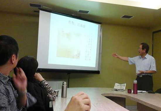 在道森学院(Dawson College), 乐祖德先生率先开讲,他以《中国诗画中的意境》为题发表演讲。在学习诗画的过程中,人们常常有一种雾里看花,知其然却不知其所以然的感觉,鉴赏名诗、名画时也常常说不出个中三昧。乐老师引用众多著名诗画的实例,让听众们逐渐摸索到欣赏的门径。