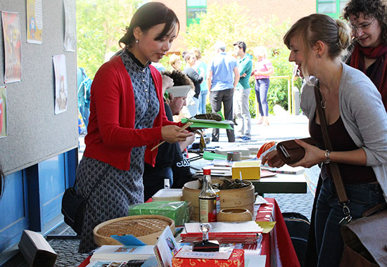 活动中,孔子学院展台展出孔院项目及汉语考试信息宣传板,并现场提供中华茶艺、传统剪纸以及中国特色美食品尝等体验活动。其中,孔院老师呈现了八款颇具特色的佳茗:白毫银针、西湖龙井、黄山毛峰、滇红、祁门红茶、霍山黄芽、云南普洱茶、安溪铁观音,吸引众多学生前来品茗。