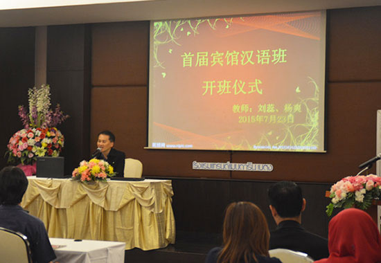 7月23日,泰国勿洞市孔子学院2015首届酒店汉语班开班仪式在勿洞市文华大酒店举行。勿洞市市长、勿洞市孔子学院理事长容志江,勿洞市孔子学院院长刘丽英,本土汉语教师及孔子学院师生共40人出席开班仪式。