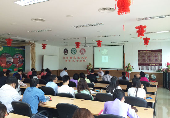 7月22日,泰国川登喜大学(Suan Dusit University) 素攀孔子学院举办汉语教学与科研主题学术讲座,广西大学文学院院长李寅生受邀担任主讲人。来自曼谷、北碧、红统、佛统、大城和素攀六个府的六十余名中泰籍汉语教师参加此次活动。