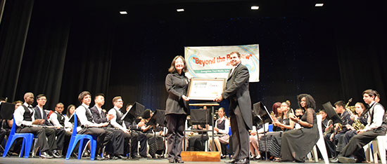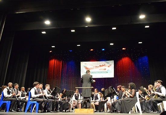 当地时间7月27日,由中国驻南非德班总领事馆、德班市政府主办,南非德班-广州友好城市协会、德班音乐学校联合承办,德班理工大学孔子学院协办的“跨越彩虹-2015中南青年交响音乐会”(Beyond The Rainbow -2015 Concert in Durban)在德班举行。来自中国广州铁一中学管乐团的近40名青年艺术家远渡重洋,与德班跨那省青年管乐团(KZN Youth Wind Band)的青年艺术家们联袂演出。南非跨那省和德班市政府官员,德班社会各界嘉宾及德班理工大学师生共600人参加此次艺术盛宴。