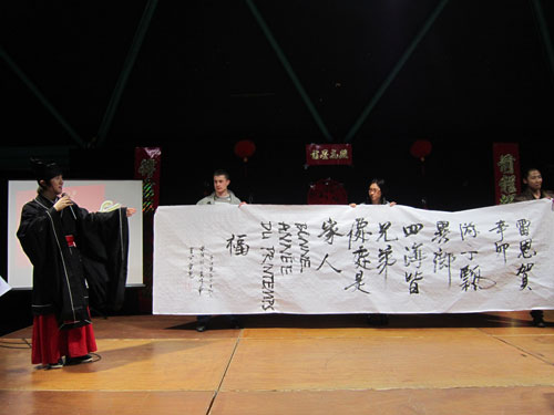 接着,雷恩青年现代舞团的四名成员为大家带来的动感活力的街舞表演,气氛变得非常热烈。随后的文艺表演突出了中国传统文化元素:身穿汉服的留学生黄俊华为现场观众展示了奇妙的中国书法,让来宾们大饱眼福;孔子学院的教工团队身着旗袍合唱了旋律优美的《好人好梦》,将中国现代女性的优雅温婉的气质表现得淋漓尽致;留学生张柳迪高唱一曲蒙古族民歌《套马杆》,尽显草原儿女的豪迈情怀;中西合璧的古筝、吉他合奏曲《女人花》,其韵味令人回味无穷。节目中间穿插的互动小游戏“中法组合猜词”,产生了超乎寻常的效果:参与者聚精会神,观众情不自禁地用语言或肢体预以提示、加油,真可谓台上台下总动员!