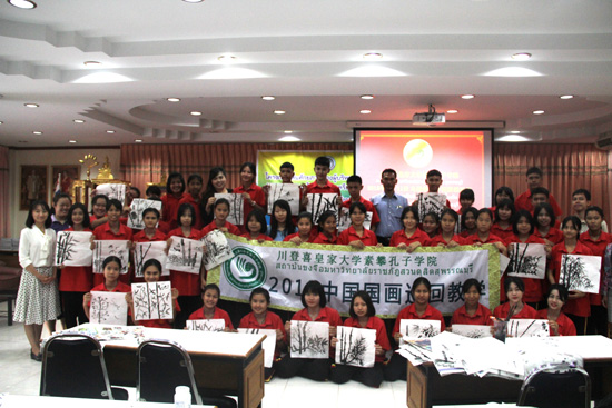 8月8日至8月22日,泰国川登喜皇家大学素攀孔子学院举办2015年中国国画巡回培训。泰国中西部地区的6个府(曼谷、素攀、红统、大城、北碧和佛统)15所院校的1000多名学生,在广西大学艺术学院山水画教师叶萍副教授的指导下,积极认真地参与了国画学习。