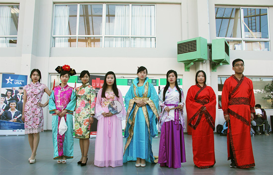 8月26日,一场别开生面的中华传统服饰走秀更是轰动了维尼亚德尔玛大学校园。孔院的教师身着汉、唐、清及民国等不同时期的华服,在悠扬的音乐中展示了中华传统服饰的美丽和优雅。聚集的人群用持续的赞叹和闪光灯表达了对演出了惊喜。随后,一场活力四射的“小苹果”舞蹈一改之前庄重优雅的氛围,老师们踩着动感的步伐,再一次博得了满堂喝彩。
