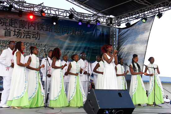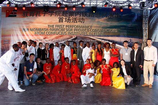 当地时间8月24日,肯尼亚内罗毕大学孔子学院师生及驻肯其他孔院师生到肯尼亚蒙内铁路第九项目经理部为蒙内铁路的员工们献上了一场妙趣横生的表演。本次文艺汇演由中国驻肯尼亚大使馆主办,中国路桥、孔子学院、中央电视台等多家单位共同筹办。中国驻肯尼亚大使刘显法、肯尼亚警察总监约瑟夫•博内特等出席活动,来自肯尼亚多家政府机构、中国使馆和中资企业代表400多人观看了文艺汇演。
