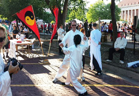 活动中,内布拉斯加-林肯大学孔子学院联合林肯市太极协会为现场观众上演了一场别开生面的太极表演秀。行云流水的表演动作吸引众多学生驻足观看。无论是团体和单人的太极空手演练,还是用古典太极武器作为防御形式的武术演练都赢得了观众热烈的掌声。