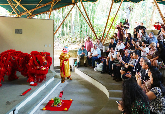 随着一声锣鼓响,第一次走进校园的舞狮队伍绕外场一周后进入主席台表演。铿锵有力的鼓点、舞狮师傅的精彩表演引起了现场观众的阵阵掌声。中国舞狮文化象征的吉祥如意使得在场观众颇为开心。校长等四位嘉宾从狮子嘴里接过吉祥如意的橘子。最后象征生财的“生菜”被舞狮队员扔向观众席,并展示出了“繁荣发展”的葡语条幅,将整个庆祝活动推向高潮。