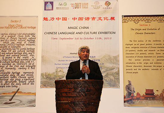 该展览由德班理工大学孔子学院、南非德班市政府、德班市艺术展览馆和德班理工大学联合主办,南非-中国人民友好协会协办。开幕式由德班市政府外办主任埃里克·阿坡格林(Mr Eric Apelgren)主持,南非基础教育部首席教育专家瑞斯(Mr WAP Ras),德班市议长罗吉·奈度(the Speaker Mr Logie Naidoo),德班理工大学校长阿迈德·巴瓦(Professor Ahmed C Bawa)、德班市艺术展览馆馆长代表图拉尼·玛卡雅(Mr Thulani Makhaye)、德班理工大学孔子学院外方院长格雷姆·斯图尔特(Professor Graham Stewart)等先后致辞。