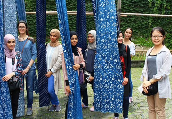 墙外行人,墙里佳人笑。来到乌镇,学生们终于可以近距离地接触中国古代市井生活的墙内风光。不同主题的博物馆为他们揭开了中国文化的源远流长。话说酒香不怕巷子深,可参观黄酒作坊还是让我们的学生受了点罪,还没进去,一股浓烈的酒香就扑鼻而来,让这些有宗教禁酒习俗的孩子们有点不知所措。不过为了一探究竟,大家还是勇敢地走了进去,古老的酒精蒸馏设备,一排排灰黑巨大的酒缸都给他们带来了新的认识。印染宅院里高高架起的竹竿,随风飞舞的蓝白印花布使学生们格外兴奋,因为这曾是他们在汉语课上看过的图片场景,而今天居然鲜活地出现在眼前,大家纷纷拿起花布转圈舞动,看着他们开心的笑容,我似乎穿越时空,想象着他们其实原属于这里。百床馆内几十架古床以它们蕴含的美好寓意和见证的真实生活而让我们思考,渴望子孙繁荣,家庭和睦,这是跨越文化却又被共同追求的美好生活;巧夺天工的古代工匠技艺同样让学生们惊叹不已。