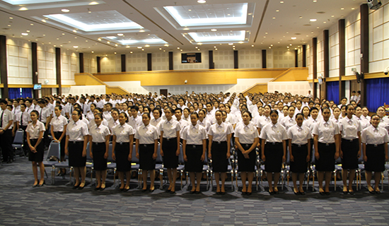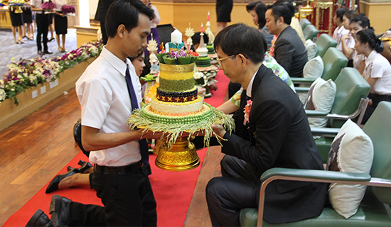 仪式上,苏比巴府尹、瓦拉尼副校长、川登喜皇家大学素攀分校校长沃拉维和吴小馨院长就坐于主席台前排,接受学生的敬拜。学生们以院系为单位,轮流上台跪拜每位教师,并献上亲手制作的花篮,教师们双手合十,一一还礼。