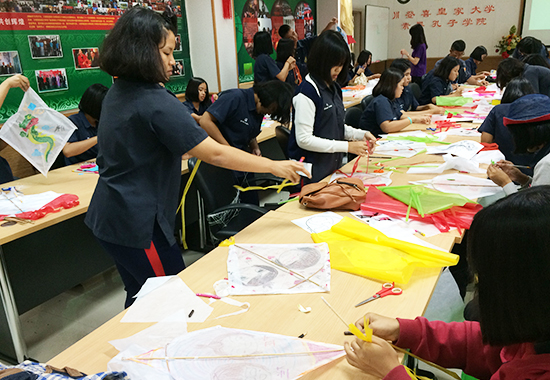 素攀孔子学院结合泰国学生学习汉语的特点,特意为学生们准备了具有中国特色的风筝图案:奥运福娃、中国龙、熊猫和京剧脸谱等。在制作风筝的过程中,学生们认真学习如何扎风筝架子,小心翼翼地在薄薄的白纸上画出他们对中国印象的图案,并给风筝的身体填上有力的翅膀和修长的尾巴,最后固定风筝线。
