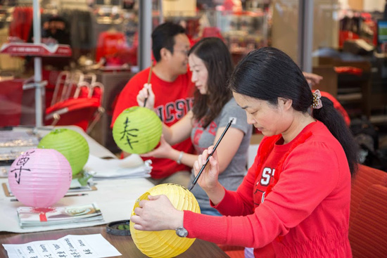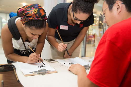 在开放日当天,孔子学院设计了体现孔院工作核心的五个关键词:传统(Tradition)、多元(Diversity)、尊重(Respect)、领导力(Leadership)和奉献(Service),并把它们题写在彩色灯笼上。在活动现场,孔子学院不仅提供灯笼题字,还提供了五个关键词的汉字书法临摹,吸引了众多外国学生和老师排队尝试神奇汉字的书写乐趣。孔院还招募志愿者穿上卡通服扮演熊猫“宝宝”,吸引众多外国学生驻足观看、留影。此外,还开展了中国传统服饰的展示与试穿,发放“筷子”等具有中国特色的小活动,深受外国学生的喜爱。