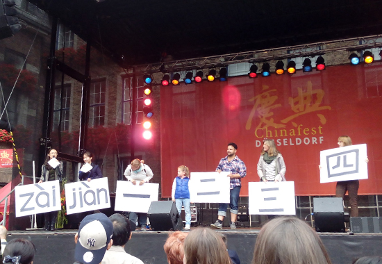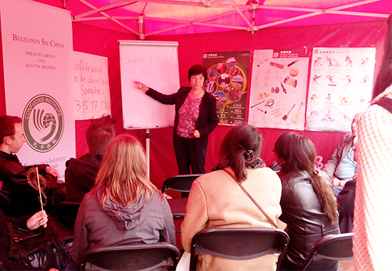 活动中,杜塞尔多夫孔子学院准备了丰富多彩的节目。中央舞台上,公派教师于淼和志愿者教师李葭与现场观众巧妙互动,带来一场有趣的中文课。短短的15分钟时间,观众们就速成了“你好”“谢谢”“再见”和数字的表达。不过瘾的汉语爱好者来到孔子学院展台,等待着整点开讲的中文体验课。