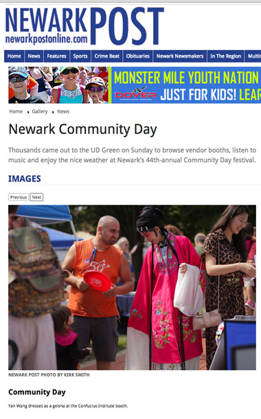 特拉华大学孔院对中国元素的展示引起本土媒体的广泛关注,在《纽瓦克邮报》关于社区日的报道中,特别呈现了多张关于孔院展位的图片,显示出孔院和中国文化元素在当地的广泛影响。