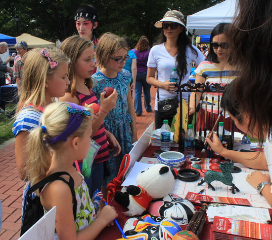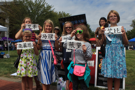 吴极老师则为市民们带来了纯正的中国书法。文房四宝摆放有序,吴老师运笔铿锵有力。他询问每个到场观众的姓名,为他们现场起中文名字,并书写出来。来自当地West Park Place School小学的教师布洛克女士看到自己的名字变成中文,并用毛笔书写出来,惊喜不已,连连赞叹“太漂亮了,太漂亮了!”蒂勒女士的儿子Mathew,认出了自己名字中的“马”,说“ M ǎ means horse.”蒂勒女士非常开心,没想到孩子在唐斯小学刚刚学了三个星期的中文,就可以说些中文,还可以认字。值得一提的是,特拉华大学孔子学院自2013年起为唐斯小学提供中文教学支持,受到校方和学员的一致好评。