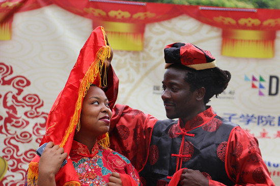 此外,孔子学院提供了颇具中国文化代表性的北京烤鸭和春卷,工作人员在参与者品尝中国美食的同时细心讲解北京烤鸭和春卷的制作方法和配料,让参与者了解中国饮食文化的历史和特点。精心布置的“时空穿越”展区备受参与者们的青睐,人们在李小龙和孙悟空的纸板人后争先恐后露脸拍照留念;同时展出的中国传统结婚礼服、民族服饰和京剧戏服更是备受欢迎,人们被精美的服装和其背后的丰富文化所吸引,不同肤色、不同种族的男女老少纷纷换上新衣,体验中国的传统婚礼、领略京剧国粹魅力。