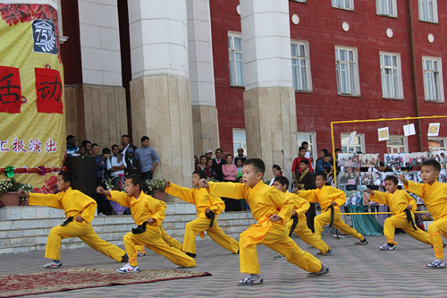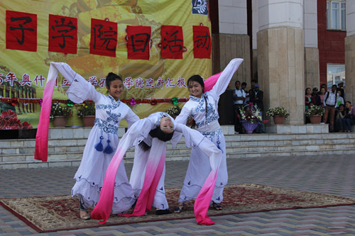 吉中歌曲合唱《茉莉花》和《SARY OI(黄昏)》拉开了演出序幕,随后孔院学生表演了民乐合奏“金蛇狂舞”、配乐朗诵《千字文》、水袖舞“盛唐华韵”、中国功夫和中国传统服装秀等精彩节目,赢得了全场观众的阵阵掌声。