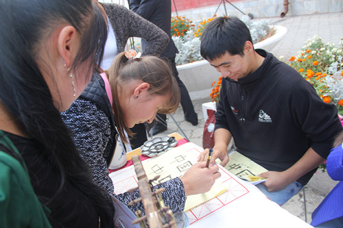 演出后,嘉宾们和奥什民众纷纷来到了孔院成果摄影展和中国传统文化体验区,不仅通过图片了解了奥什孔院“仁爱至善、情感交融、文化互动、传承发展”的建设理念和丰富多彩的教学、文化生活,还亲身感受到了中国传统文化的魅力。中国书画、剪纸、茶艺、乐器、编织、趣味运动,一个个精心设计的文化体验区给人们带来了乐趣与欢乐。有的拿着毛笔学写“中国”两字,有的俏皮地踢着中国的毽子,有的手握着笛子学老师样用力吹着,有的拨弄着古筝的琴弦……现场气氛十分活跃。