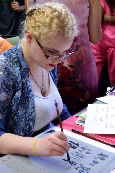 中国剪纸、折纸展台上的学生里三层、外三层,孔子学院教师被热心学习的学生包围在中间,他们跟随着老师的一举一动,认真地画、剪、折、粘,当完成的作品呈现在他们面前时,学生们都兴奋不已。最具魅力的中国传统书法展台上,刘老师泼墨挥毫,一行行行云流水的中国汉字让学生惊叹不已,都跟着一笔一画、有模有样地写起汉字来。中国字“龙”“美好”“爱”等成了现场最受欢迎的汉字。