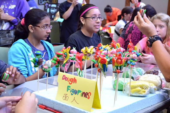 捏面人展台上,各式卡通人物大受欢迎。当“忍者神龟”、“神奇宝贝”等一个个学生们耳熟能详的卡通角色,在他们面前栩栩如生地出现时,引起了全场轰动。美国学生跟随李老师的手法,揉、团、捏、搓,一只只活灵活现、可爱的小鸭子最后被捧在了手掌心。一名美国学生由衷地赞叹:“从来没想到手工作品可以如此精致,这真是太神奇了!”。