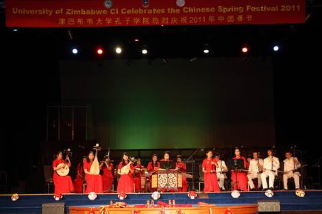 当地时间2011年2月14日晚,哈拉雷庆典中心(Celebration center)张灯结彩,一派节日景象,津巴布韦大学孔子学院喜迎兔年新春联欢晚会在这里拉开序幕。传统的中国民间音乐、地道的中文歌曲演唱、富有当地特色的乐器演奏、舞蹈演出,带给观众的是一场跨文化的视听盛宴。