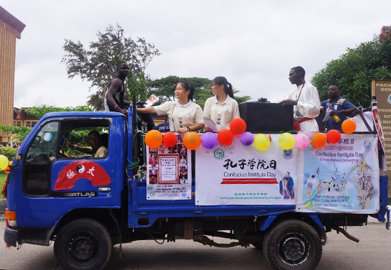 此次庆典分为两部分。首先是装点一新的孔院花车沿拉各斯大学校内外及附近街区游行,旨在全方位增强当地人对孔子学院的了解,扩大孔子学院的宣传力度和影响力。装饰漂亮、引人入胜的花车加上悦耳动听的音频和孔院介绍,引得行人驻足观看,纷纷上前询问了解。孔院尼方职工沿途发放孔子学院宣传册和“常用汉语30句”,受到当地民众的欢迎。人们认真地研读常用汉语30句,还不时向中国老师请教。他们兴奋地说,早就听说孔子学院是帮助尼日利亚人学习汉语的机构,今天亲眼目睹中国老师能耐心地教授中文,我们一定要去孔子学院好好学习强大的中文,这样才能与国际接轨。