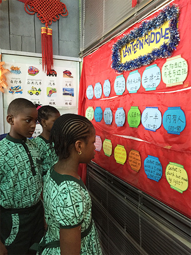 花车游行结束后,人们涌向拉各斯大学继续参加中秋活动。喜庆的大红灯笼、传统的宫廷灯笼、中国结、中国挂历、中秋展板、中秋灯谜等富含中国文化元素的装饰品让活动现场充满了浓郁的节日氛围。