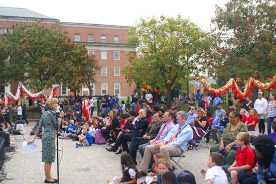 马里兰大学孔子学院外方院长唐娜(Donna Wiseman)在致辞中,对来自社会各界的朋友表示欢迎,她深情回顾了孔子学院11年来的成长路程,并指出孔子学院一直在传播和平理念,为中美两国人民的互相交流和互相理解努力做出贡献。她说:“今天,白宫正在为中国国家主席习近平举办隆重的欢迎仪式,而我们在这里举办中国语言文化节,这充分体现了中美两国人民不断发展的友好关系”。随后,唐娜和崔建新两位院长向最新批准的5家孔子课堂授牌。
