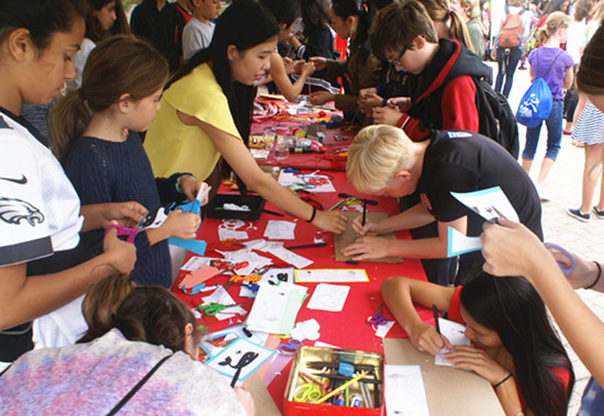 会场中,孔子学院还设置了4个中国文化展台,吸引众多学生参与。书法绘画台上,许多学生跟着老师学画中国画和脸谱,练习写汉字;手工展台周围围绕着一群学生学习剪纸,学习编织中国结;书籍展台前,许多学生在看最新出版的汉语书籍和教学产品;和平留言台上长长的纸卷留下了数不清的祈盼和平的动人词句。
