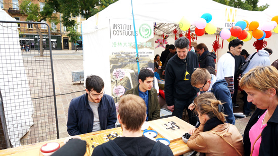当地时间9月26日,法国洛林大学孔子学院在梅斯市开展多项丰富多彩的活动,热烈欢庆全球孔子学院日。孔子学院不仅在市中心共和广场设立展台广邀市民群众前来体验中国文化,更请到来自北京语言大学艺术团的二十余位艺术家登台表演,吸引了广大市民驻足欣赏。