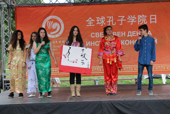 参加活动的市民们,可以品一品香甜可口的中国茶,或在书法展台前驻足,跟老师练习写一下汉字,并尝试着用汉语写出自己的名字;在汉语公开课的帐篷里,很多孩子和大人跟着汉语教师一起高声朗读一些常用的汉语词汇和句子,当他们可以自己说出“你好”、“谢谢”、“我爱你”的时候,都表现出极大的兴趣;歌舞表演的舞台上,既有来自索非亚孔院教学点的学生表演的《找朋友》《大姑娘美》《小苹果》《明月几时有》,既有庆祝中国中秋佳节的展示和舞蹈,也有保加利亚民族舞蹈团带来的传统舞蹈,中国汉语教师还演唱了几首保加利亚人民耳熟能详的经典民歌;最后,保加利亚学生身着中国传统民族服饰,孔子学院的汉语教师穿保加利亚传统民族服装,上台表演了一场“服装秀”,充分体现中保两国文化交流的宗旨,在欢乐祥和的背景音乐中,突出了“文化交流与世界和平”的主题,把活动推向高潮。