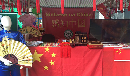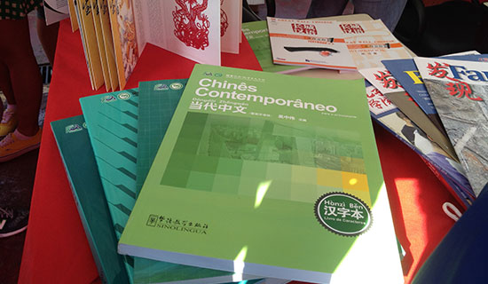 此外,“感知中国”双语横幅、中国国旗和孔院院旗把展台映衬得红红火火,中国结、传统服饰、折扇和竹简书吸引了众多好奇的目光,孔院的葡语版教材和孔院课程宣传页等材料更是引得大家驻足翻看。许多观众捧着《跟我学汉语》的课本,试着朗读。活动期间,许多人表示想要学习汉语、了解中国文化,还向孔院教师咨询汉语课程的相关事宜。值得一提的是,巴基斯坦展位的负责人只有两名军官,他们听说孔院教师也在现场时,特意抽时间赶来用汉语跟孔院教师打招呼和道谢。
