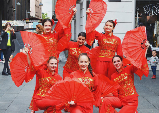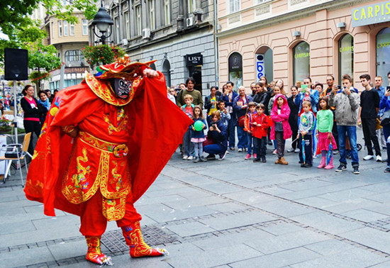 此次活动分为“文艺表演”、“我来说汉语”公开课堂和“中国特色文化体验”三个部分。孔子学院汉语班中学生表演的扇子舞拉开活动帷幕。身着红色舞衣的塞尔维亚姑娘伴着一曲《青花瓷》翩翩起舞,精彩婉约的舞蹈立刻吸引了行人的驻足和关注;由当地中国艺术爱好者表演的变脸更是神秘莫测,一招一式令观众们感叹神奇;身着旗袍的孔子学院教师婉转动听地唱起了中国民歌《好一朵美丽的茉莉花》;武术协会会员的中华太极拳表演以及孔院中学生合唱团的《大中国》等节目也博得了观众的阵阵掌声。