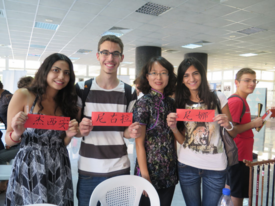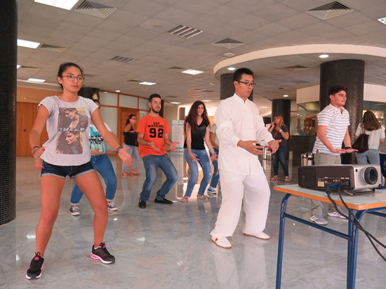 活动中,孔子学院精心设计了多种多样的表演节目。黎巴嫩学生对中国功夫十分感兴趣,在“八段锦”演示现场,杜海宝老师结合图片和PPT,一招一式地指导学生,不一会儿学生们就像模像样的表演起来。