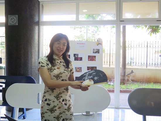 冯涛老师的“书法”演示现场,学生们对中国书法的“笔墨纸砚”非常好奇,听完冯老师的讲解和演示后,他们也自己操练起来,但他们最喜欢的还是让冯老师用汉语写下他们的名字留作纪念。张萍老师现场展示“茶艺”,学生们一边品茶,一边听张老师讲解中国茶艺文化。
